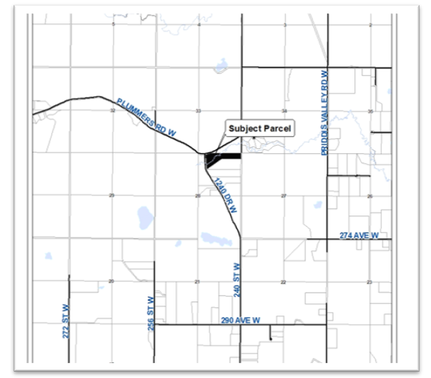 Foothills County has received an application from agent Robert Weston of ERW Consulting Inc. on behalf of landowners 2480574 Alberta Ltd. proposing the redesignation of the 2 subject parcels from Agricultural District to Country Residential District to allow for the future subdivision of 18 Country Residential District lots, ranging in size from 4.19 +/- acres to 9.18 +/- acres, with approximately 16.21 +/- acres to be protected by way of Environmental Reserve Easement.