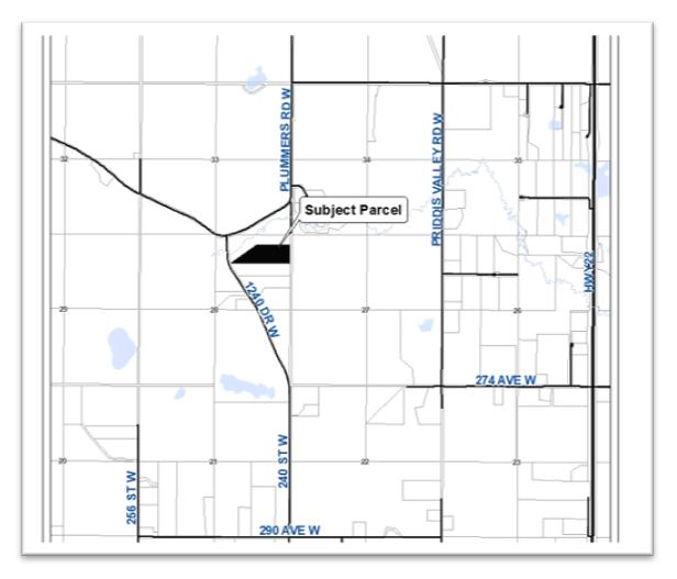 As shown on the location map, the subject parcel (shaded in black) is located within Council Division 3, is approximately 1.64 km west of Priddis Valley Rd W, approximately 2.94 km north of 290 Ave W, and is directly southeast and adjacent to the intersection of Plummers Rd W and 1240