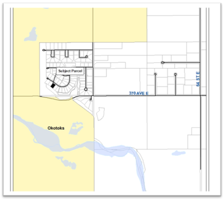 As shown on the location map, the subject parcel (shaded in black) is located within Council Division 7, approximately 0.33 km northwest of 370th Avenue, approximately 2.2 km west of 64th Street E, and approximately 0.17 km east of the Town of Okotoks.