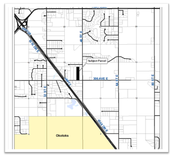 As shown on the location map, the subject parcel (shaded in black) is located within Council Division 7, directly north and adjacent to 306 Avenue E, approximately 0.55 km east of Highway 2, approximately 0.14 km west of 48 Street E and approximately 1.60 km north of the Town of Okotoks.