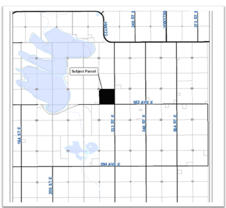 As shown on the location map, the subject parcel (shaded in black) is located within Council Division 1, directly north and adjacent to 562 Avenue E, directly west and adjacent to 232 Street E and approximately 2.4 km south of Highway 23.