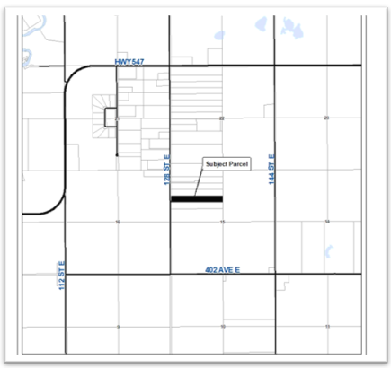 Foothills County has received an application from landowner Dave Turner proposing redesignation of a +/- 7.50 acre portion of the 158.97 acre Agricultural District parcel to Country Residential District to allow for the future subdivision of a +/- 7.50 acre Country Residential District first parcel out. Further, a Site-Specific Amendment is requested to allow for relaxations to the number and cumulative size and setback distances to existing accessory buildings on the proposed parcel.