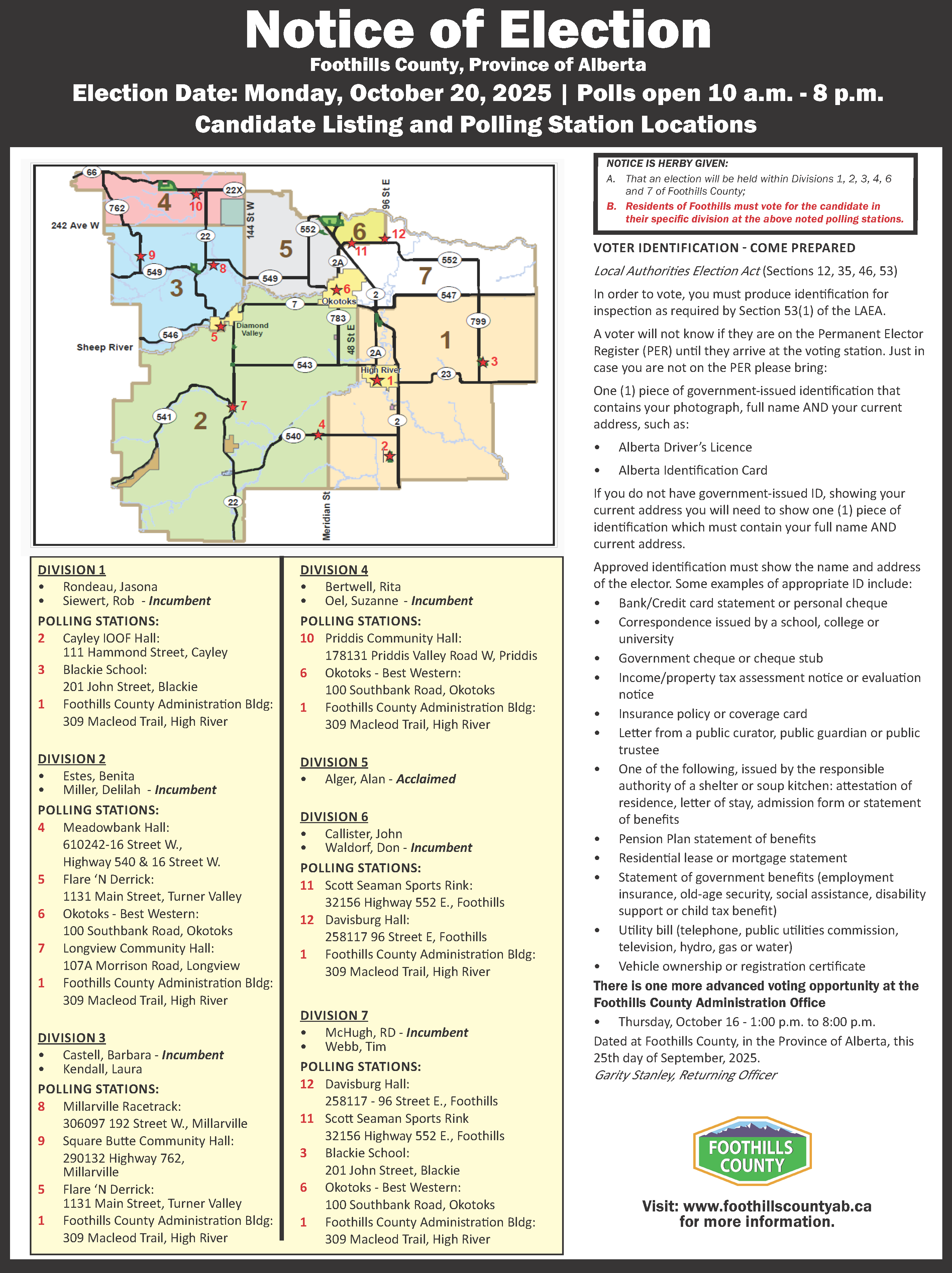 Come out and vote in the Foothills County municipal election. You can still come and vote if you did not register on the permanent electors list.