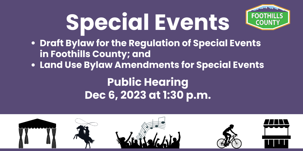 A public hearing has been scheduled for December 6, 2023, at 1:30 P.M. to provide information on a draft NEW “Special Events Bylaw for the Regulation of Special Events in Foothills County” and corresponding amendments to the County’s Land Use Bylaw for Special Events.