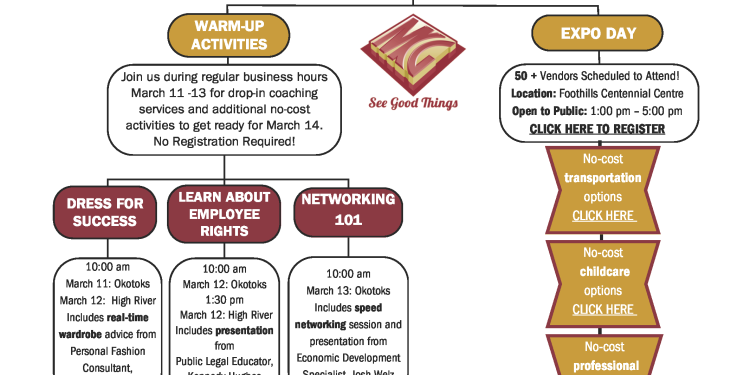 In addition to the Expo, three drop-in sessions are available: Dress for Success (March 11 at 10 a.m. in Okotoks and March 12 at 10 a.m. in High River); Learn About Employee Rights (March 12 at 10 a.m. in Okotoks and 1:30 p.m. in High River); and Networking 101 (March 13 at 10 a.m. in Okotoks).